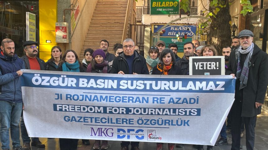 Di daxuyaniyê de pankarta “Çapemeniya Azad nayê bêdengkirin” hate hilgirtin.