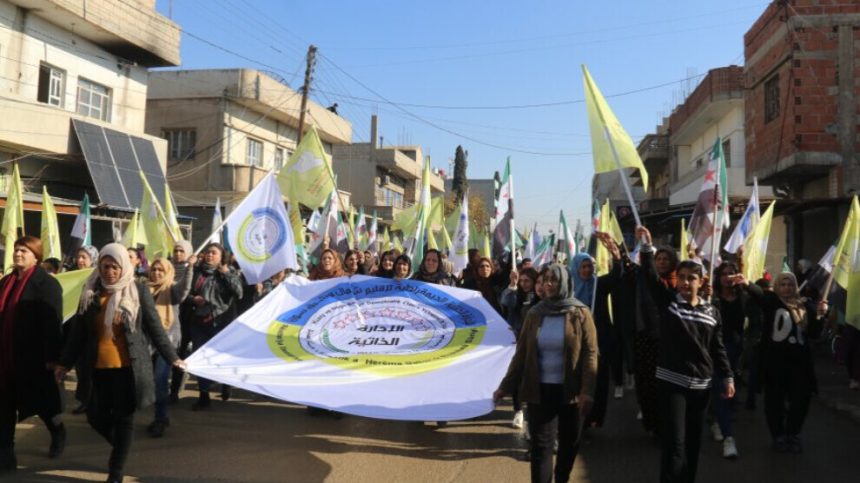 Şênî ji Qada Jina Azad kom bûn, bi hildana alên QSD û Rêveberiya Xweser, ala Sûriyeyê û bi vekirina pankartên “Em li dijî dagirkeriyê hevgirtî bin”, “Na ji dagirkeriyê re”, “QSD hêza me ye”, “Bijî biratiya gelan”, “Bijî yekitiya Kurd, Ereb û Suryan” û “Bijî yekitiya gelê Kurd” dest bi meşê kir.
