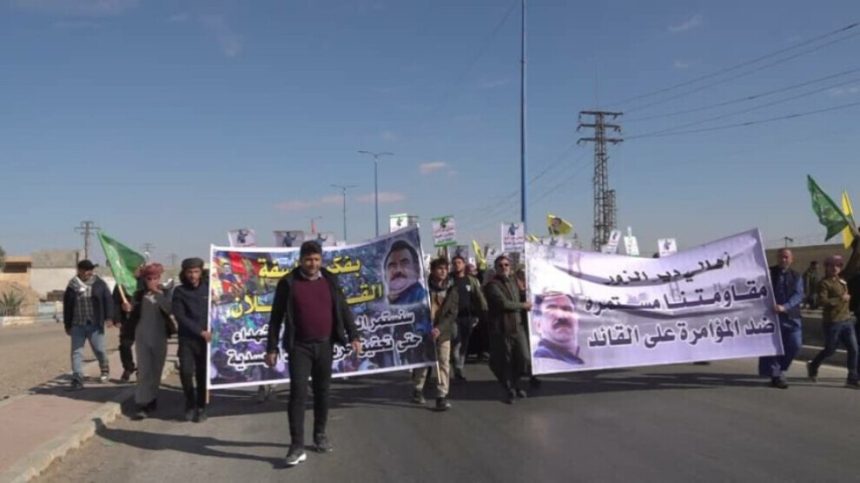 Ji bo şermezarkirina pergala êşkence û qirkirinê ya li dijî Rêber Apo û banga azadiya wî ya fîzîkî xelkê kantona Dêrazorê xwepêşandaneke girseyî li dar xist.