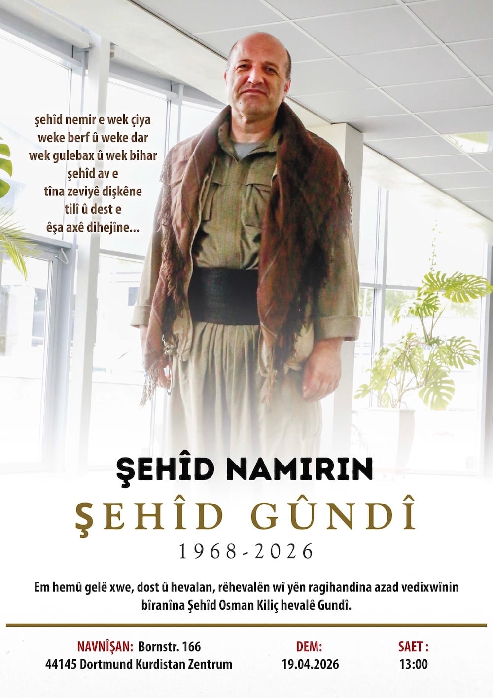 Bîranîn dê sibê (19’ê Nîsana 2026) saet di 13:00’an de li Navenda Kurdistanê ya li Dortmundê were lidar xistin.