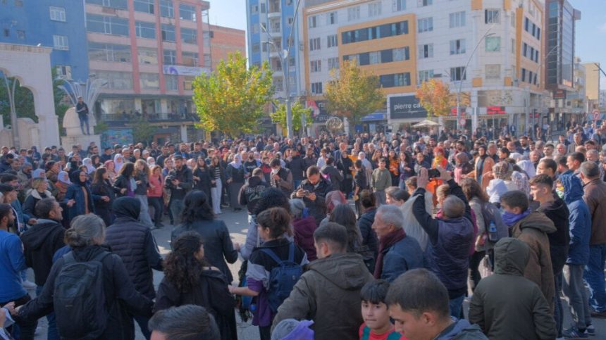Girseya li Taxa Kulturê hate gel hev, bi dirûşme, çepik û tililiyan ber bi Xaçerêya Basinê ve meşiya. Di meşê de dirûşmên “Bijî Serok Apo”, “Bê Serok jiyan nabe”, “Kurdistan dê ji faşîstan re bibe goristan”, “Bijî berxwedana gele kurd”, “Em ê bi berxwedanê bi ser kevin” hatin berzkirin. Ciwan jî bi dirûşma “Bijî Serok Apo” beşdarî meşê bûn. Welatiyên derdorê jî bi çepikan piştgirî dan meşvanan. Girseya gihiştî Xaçerêya Basinê, berê xwe dan noqteya polîsan û anonsa “Hişyarî hişyarî, şaredariya me vala bikin” kirin.