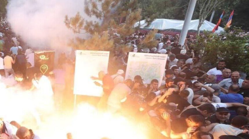Roja Çarşemê bi hezaran kes li ber parlamentê li hev kom bûn û daxwaza îstifaya Paşînyan kirin. Piştî ku xwepêşandêran hewl dan ji benda polîsan derbas bibin û polîsan bombeya şokê bi kar anîn, aloziyê rû da.