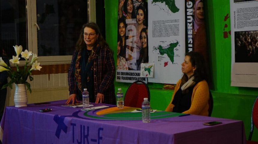 Axaftina vekirinê li ser navê Austellunggruppe Jin Jiyan Azadî, ji aliyê Newroz Sonmezer ve hat kirin. Newroz Sonmezer diyar kir ku pêşangeh bi armanca xuyakirina destkeftiyên dîrokî û siyasî yên şoreşa jinê hatiye amadekirin.