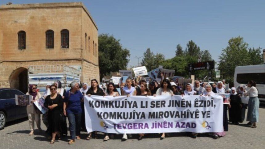 Di salvegera 11’emîn a komkujiya ku DAÎŞ’ê di 3’ê Tebaxa 2014’an de li hemberî civaka Êzidî kir, li navçeya Mîdyat a Mêrdînê bi banga Tevgera Jinên Azad (TJA) meşek hat lidarxistin. Bi sedan kesên li qada Newrozê kom bûn, bi pêşengiya jinan pankarta bi nivîsa “Qetilkirina jinên Êzidî sûcê li dijî mirovahiyê ye” meşiyan. Di meşê de pankratên ku komkujiyê şermezar dikin hatin hilgirtin û wêneyên cangoriyan hatin hilgirtin û dirûşmên weke “Jin jiyan azadî”, “Şengal rûmeta me ye” û “Jinên Êzidî rûmeta me ne” hatin berzkirin.