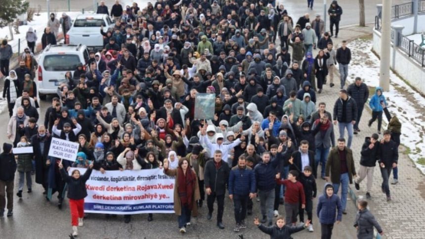 Li Çewlîgê di meşê de pankarta bi nivîsa “Rojava nikare bê teslîmgirtin” hate hildan û di meşê de dirûşmên “Bijî berxwedana Rojava” û “Kurdistan wê ji faşîzmê re bibe goristan” hatin qîrîn. Li Qada Bajêr daxuyaniyek hate dayin û ji bo rawestandina êrişan bang hate kriin.