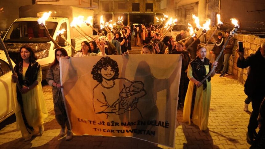 Jinên ku li ber avahiya Rêxistina Partiya Wekhevî û Demokrasiyê ya Gelan (DEM Partî) a Hezexê hatin cem hev, bi meşaleyan ber bi qada pîrozbahiyê ve meşiyan. Jinan di meşê de posterê Rehşan Demîrel a ku di sala 1992’yan de ji bo protestokirina êrişên li ser pîrozbahiyên Newrozê laşê xwe dabû ber agir, hilgirtin.