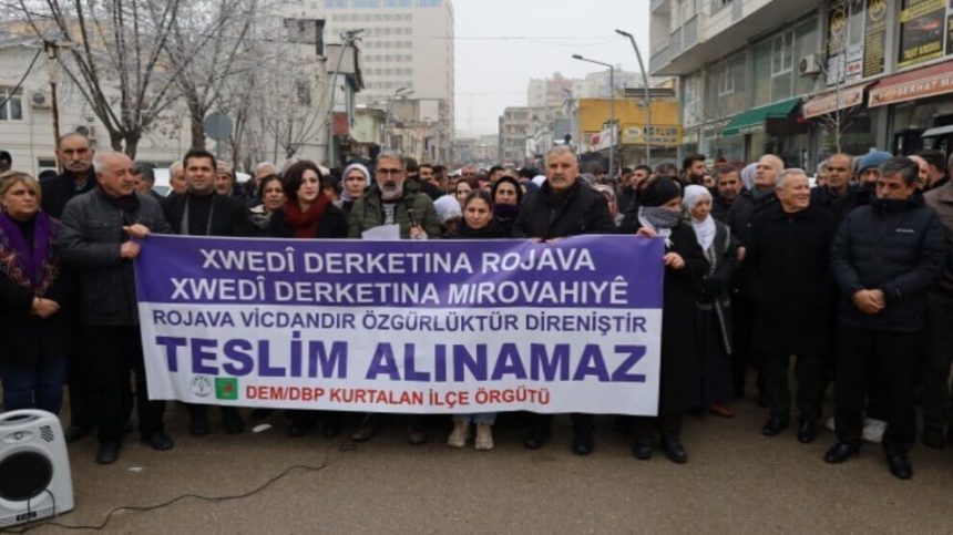 Platforma Saziyên Demokratîk têkildarî êrişên li dijî Rojava li navçeya Kerboran a Mêrdînê meşek li dar xist. Parlamenterên DEM Partiyê, hevşaredar, endam û rêveberên partiyên siyasî û saziyên sivîl ên civakî di nav de gelek kes tev li meşê bûn.