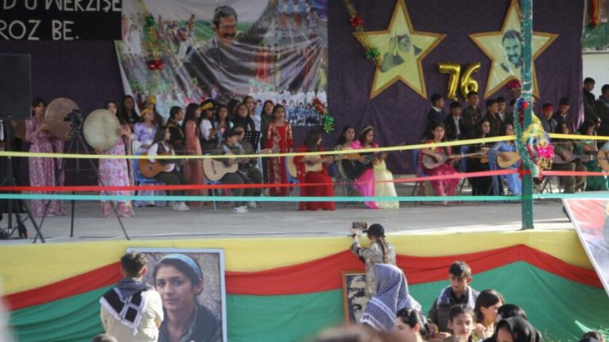 Qada şahiyê bi wêneyên Rêber Apo, alên PKK, KCK û KJK’ê hatibû xemilandin. Xwendevanên wargehê bi cil û bergên Kurdî û bi meşekî bi heybet ketin qada pîrozbahiyê.