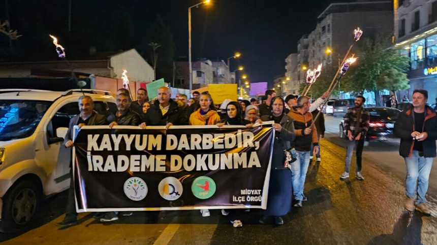 Li navçeya Midyadê ya Mêrdînê desteserkirina Şaredariya Bajarê Mezin a Mêrdînê, şaredariyên Êlih û Xelfetiyê bi meşa meşaleyî hat protestokirin. Girse ji navenda navçeyê heta xaçerêyê meşiya û pankarta “Qeyûm darbe ye, dest nede vîna min” vekirin. Parlamenterê Mêrdînê yê Partiya Wekhevî û Demokrasiyê ya Gelan (DEM Partî) George Aslan, Hevşaredara Bajarê Mezin a Mêrdînê Devrîm Demîr, rêxistinên DBP û DEM Partiyê yên bajar û navçeyan û gelek kes tevlî meşê bûn. Di meşê de dovîzên “Bimre koletî bijî azadî”, “Qeyûm bicehime”, “Berxwedan jiyan e” hatin hilgirtin û timî dirûşmeya “Bijî berxwedana Êlihê” hat berzkirin.