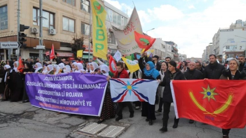 Bi banga Platforma Saziyan a Demokratîk, girseya gel li ber avahiya navçeya Mîdyadê ya Mêrdînê ya DEM Partiyê li hev civiya, bi dirûşman ber bi navenda bajêr ve meşiya û peyama piştgiriyê da.