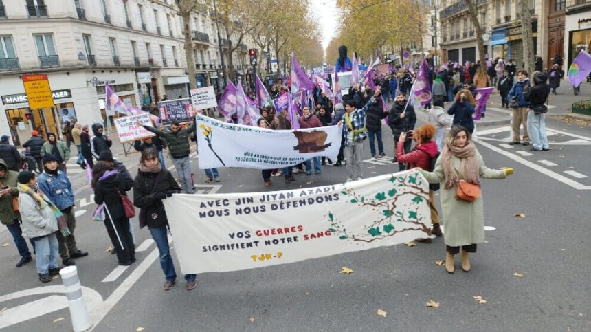 Bi sedan jin û mêrên ku bi pêşengiya Tevgera Jinên Kurd a Fransayê, li Qada Republique ya paytexta Fransa Parîsê li hev civiyan, li dijî tundiya li ser jinê meşiyan. Çalakvanên ku pankartên bi nivîsên, “Jin ne kole ne”, “Ji tundiya jinê re na”, “Jin pîroz in” û “Dest nede jinê” hilgirtin, bi dirûşmeyên “Jin, Jiyan, Azadî” li kolanan dengê xwe bilind kirin.
