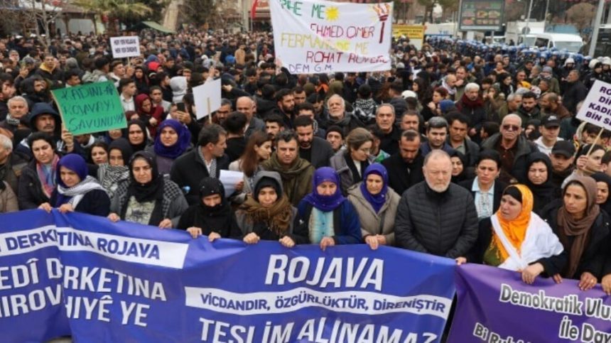 Cîgihê Serokên Koma DEM Partiyê Sezai Temelli jî diyar kir Rojava di nav dojeha Rojhilata Navîn de jiyanê ava dike û ev tiş gotin: “Ji bo wê jî netew dewlet Rojava bi awayekî hovanê hedef digirin. Ji bo wê xwedî derketina Rojava xwedî derketina azadî û aştiye ye. Ew êriş bi xwedî derketina paradîgmaya birêz Ocalan pêkan e. Birêz Ocalan di 27’ê Sibatê de rêya aştî û civaka demoktîk nîşan da. Divê li her derê em aştî û Civaka demoktîk ava bikin. Birêz Ocalan tevî polîtikayên desthilatê jî pêvajoya aştiyê didomîne. Em nê di rê ya netew dewletan de di rêya sêyemîn de meşa xwe bidomînin. Dibêjin em dewleta Kurdan in jî madem hûn dewleta Kurdan in deriyê sînor vêbikin ku bila alîkarî bigehejê welatiyên Kobanê. Hemû gelên Tirkiyeyê divê bibin hemwelatiyên wekhev. Heke tu deriyê sînor vêneke ne dewlet û ne jî desthilat e.”
