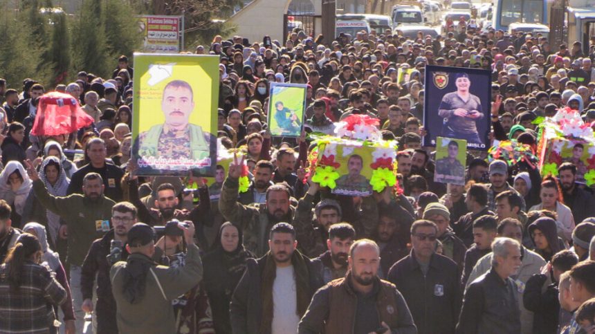 Bi hezaran şêniyên Qamişloyê beşdarî merasîma veşartina cenazeyên 5 şehîdên Hêzên Sûriyeya Demokratîk (QSD) û Hêzên Ewlekariya Hundirîn-Jin bûn. 5 şervan di encamên êrîşên hewayî yên dewleta Tirk a dagirker û çeteyên wê de li Qamişlo, Minbic û Helebê şehîd bûbûn. Merasîm li Pakrewangeha Şehîd Delîl Sarûxan a li Qamişlo pêk hat.