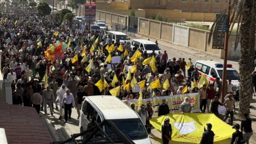 Şêniyên kantona Reqayê îro meşeke girseyî li dar xist û piştgiriya xwe ya ji bo Hêzên Sûriyeya Demokratîk (QSD) nîşan da.