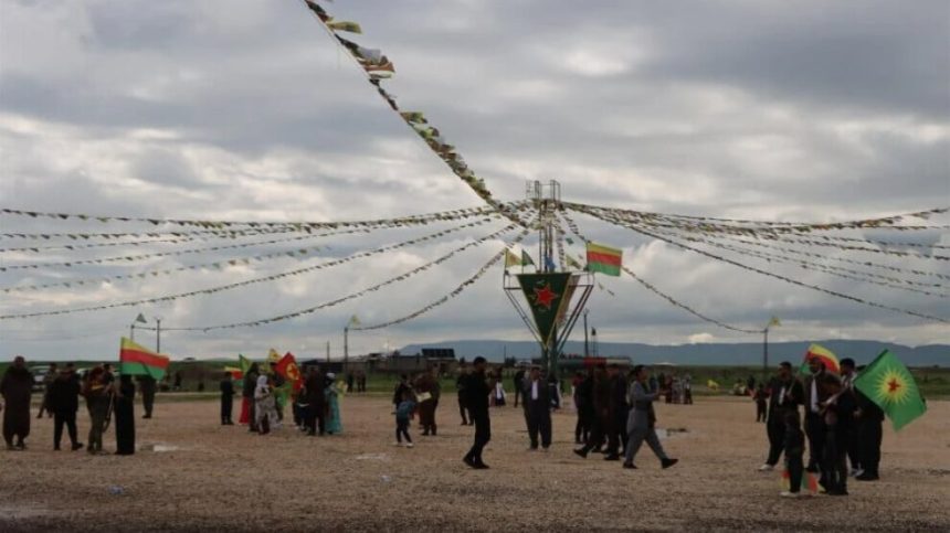 Qada pîrozbahiyê bi wêneyên Rêber Apo, alên YPJ, YPG, Meclisa Malbatên Şehîdan û pankartên “Newroz pîroz be” hatiye xemilandin.