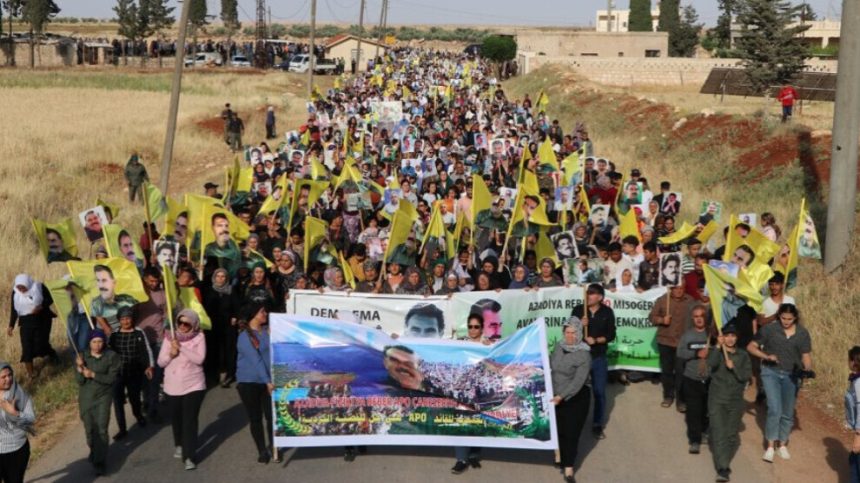 Meş ji rêya di navbera gundê Til Qerah û Til Sosîn a bajaroka Ehdasê de dest pê kir. Gel wêneyên Rêberê Gelê Kurd Abdullah Ocalan û pankartên ˊAzadiya Rêber Abdullah Ocalan azadiya gelan eˊ hildan.
