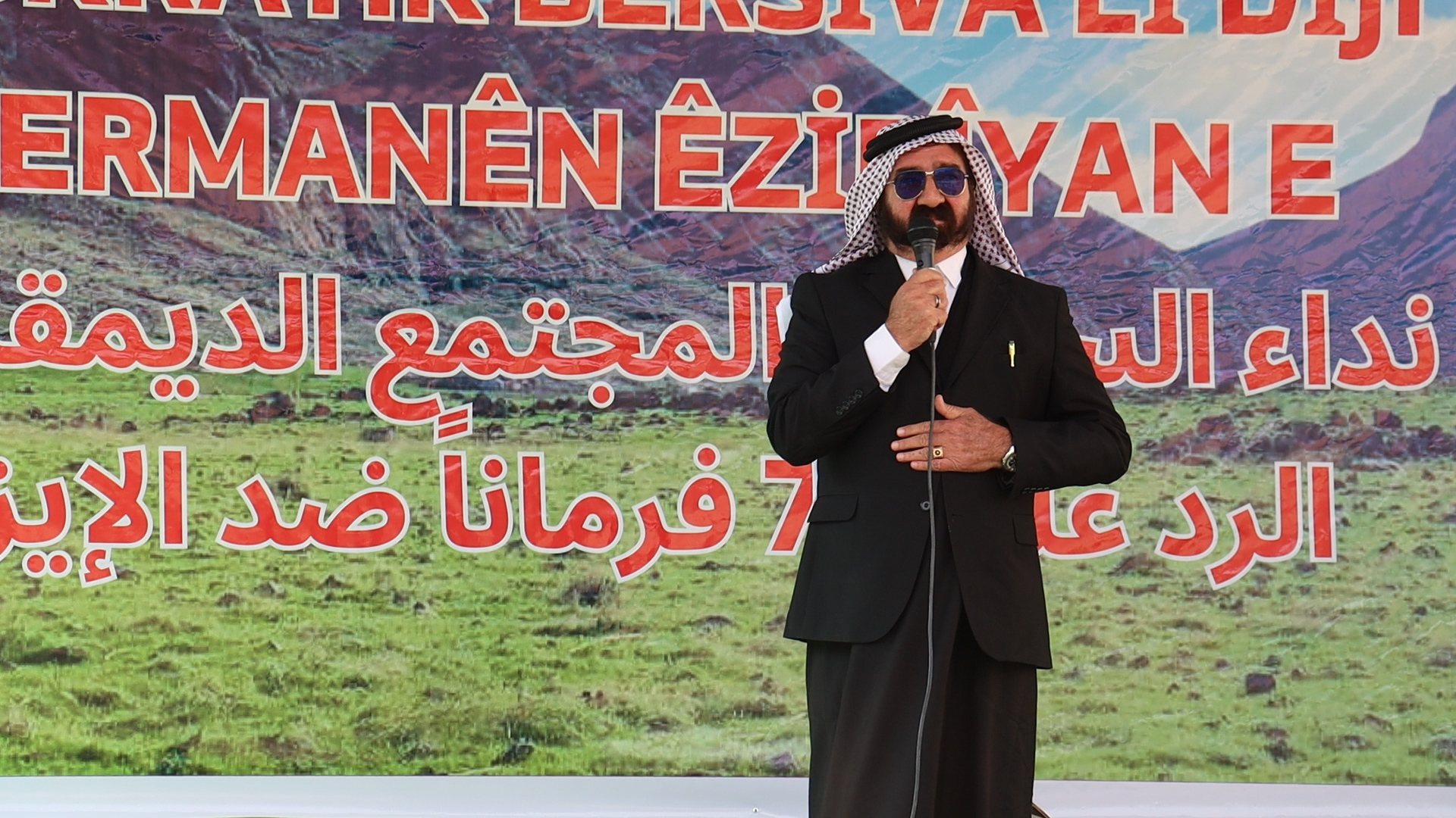 Şahî îro di derdora saet 14.00’an de bi dirûşmeya, ‘‘Banga Aştî û Civaka Demokratîk, bersiva li dijî 73 fermanên Êzidiyan e’ bi deqîqeyek rêzgirtin ji şehîdên Êzidxanê û têkoşîna azadiyê destpkir.