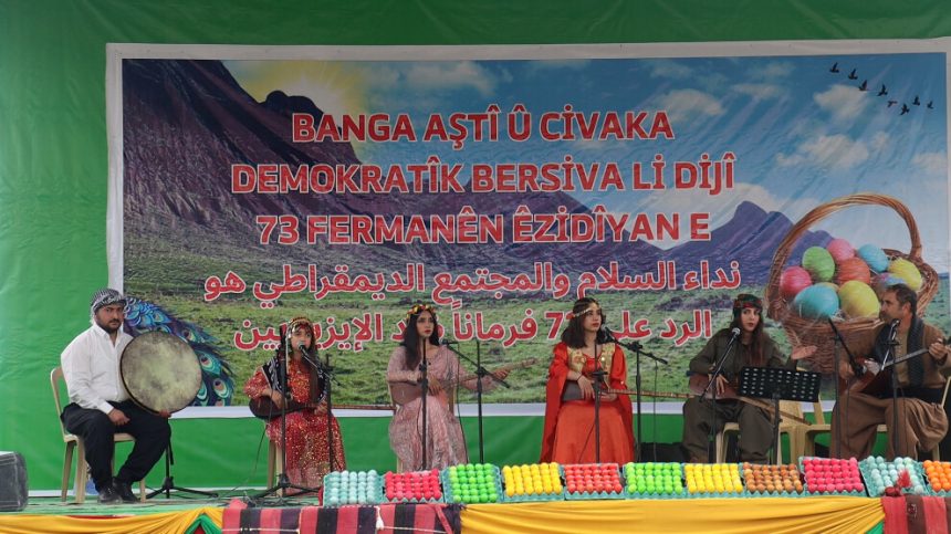 Di şahiyê de peyama Rêber Apo ku dibêje, ‘‘Wê ev bang bibe ronesansa Êzidiyan’ hate xwendin û paşê jî hevserokê MXDŞ’ê Nayîf Şemo bi navê Rêveberiya Xweser peyamek da û cejnê li hemû Êzidiyan pîroz kir.