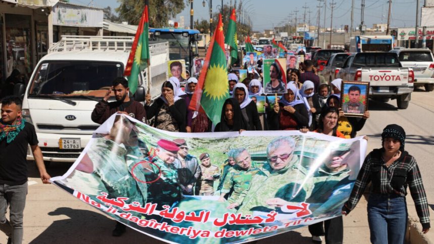 Di meşê de dirûşma, ‘Na ji dagirkeriya dewleta Tirk re’ li ser wêneyê fermandarên PDK’ê yên li gel fermandarên dagirker ên Tirk li ser sînor hatiye kişandin hate rakirin. Bi sedan wêneyên şehîdên Şengalê û bi taybet jî şoreşger û pêşengên civaka Êzidî yên bi destê dewleta Tirk û PDK’ê hatine şehîdxistin hatin rakirin. Girseya gel dirûşmên wekî, ‘Qatil Erdogan’ û ‘Bijî Berxwedana Şengalê’ gotin.