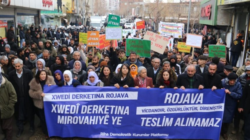 Platforma Saziyên Demomratîk, tekildarî êrîşên HTŞ, DAÎŞ, SMO û komên paramîlîter ên giredayî Tirkiyeyê yên ser Rojava, li navçeya Girêsor a Rihayê meş li dar xist. Hevseroka Giştî ya Partiya Herêmên Demokratîk (DBP) Çîgdem Kiliçgun Uçar, endam û nûnerên partiyên siyasî û saziyên giredayî platformê tevlî meşê bûn.
