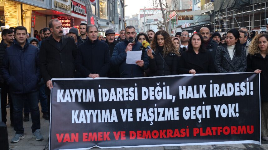 Platforma Ked û Demokrasiyê ya Wanê, li navenda bajêr li Koçeya Hunerê li dijî desteserkirinê daxuyanî da. Hevserokên DEM Partî yên Wanê Gulşen Kurt û Veysî Dîlekçî, saziyên sivîl ên bajarê û gelek nûnerên partiyan tevlî daxuyaniyê bûn.
