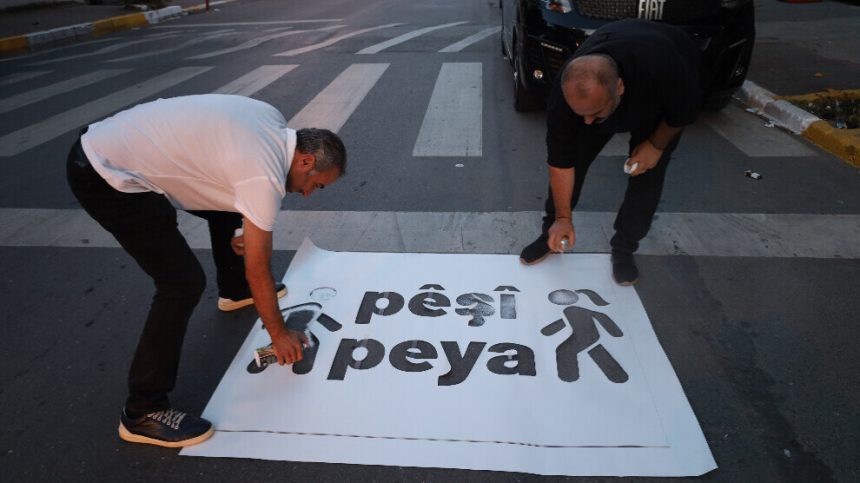 Hevberdevkê Kongreya Demokratîk a Gelan (HDK) Cengîz Çiçek û Parlamanterê Partiya Wekhevî û Demokrasiyê ya Gelan (DEM Partî) Celal Firat li dijî jêbirina nivîsên hilyariyê yên “Pêşî Peya” ên bi kurdî ku li Kurdistanê tên jêbirin”, li navçeya Eyupsultan a Stenbolê li ser Kolana Cengîz Topelê “Pêşî Peya” nivîsandin.