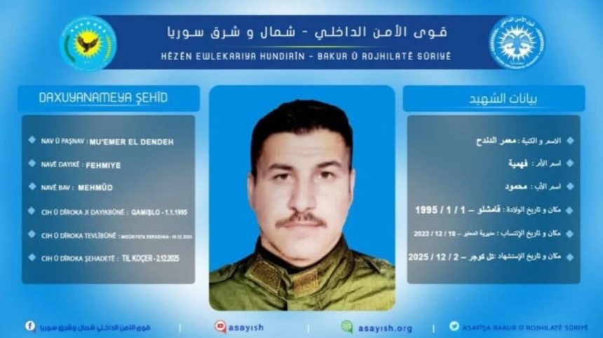 Fermandariya Giştî ya Hêzên Ewlekariya Hundirîn a Herêma Bakur û Rojhilatê Sûriyeyê bi daxuyaniyekê şehadeta endamekî xwe ragihand.