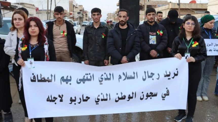 Şêniyan pankartên” Azadî ji bo dîlgirtiyan, dengê me yek e, doza me yek e” Çav li benda dîlgirtiya qurimîn” û siloganên ku daxwaza serbestberdana dîlgirtiyan dikin hat rakirin.