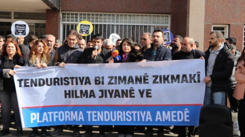 Li dijî astengiya polîsan girse dest bi meşê kir û gelek caran dirûşmên “Bê ziman jiyan nabe” û “Zimanê me rûmeta me ye” berz kirin.