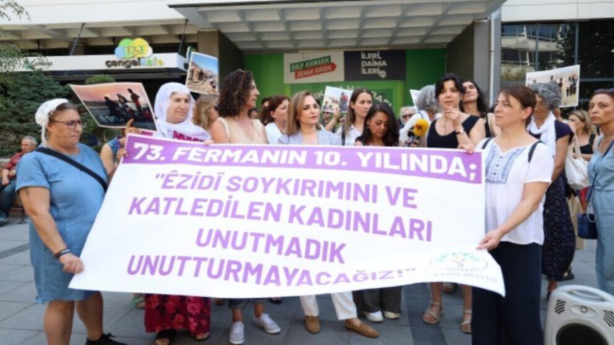 Meclisa Jinan a Partiya Wekhevî û Demokrasiyê ya Gelan (DEM Partî) bi boneya 10’emîn salvegera komkujiya çeteyên DAÎŞ’ê ya li ser Êzidiyan li Kolana Sakaryayê daxuyaniya çapemeniyê li dar xist. Di daxuyaniyê de ku gelek kes û jinên Femînîst ên Sosyalîst, Navendên Civakî, EHP û TÎP’ê jî amade bûn. Di daxuyaniyê de pankarta “Me di 10’emîn salvegera fermana 74’an de qirkirina Êzidiyan û jinên hatin qetilkirin ji bîr nekir. Em ê rê nedin wan ji bîr bikin.” Wêneyên ji komkujiyê hatin hilgirtin. Girseyê gelek caran dirûşmeyên, “Kujer DAÎŞ e” “Hevkar AKP” û “Jin jiyan azadî” hatin berzkirin.