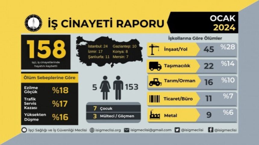 Li gorî rapora ÎSÎG’ê, di meha Çileyê de 7 jê zarok bi giştî 158 karker li Tirkiye û Bakurê Kurdistanê jiyana xwe ji dest dan.