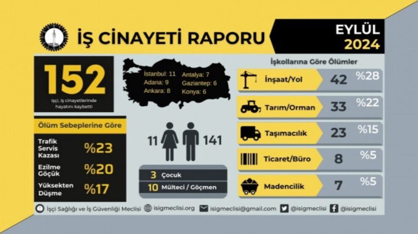 Meclîsa Tenduristiya Karker û Ewlehiya Kar (ÎSÎG) Rapora Cînayeta Kar a Îlona 2024’an eşkere kir. Li gorî raporê di meha Îlonê de 152 karker di cînayetên kar de jiyana xwe ji dest dan. Ji 152 karkeran 11’ên wan jin in.