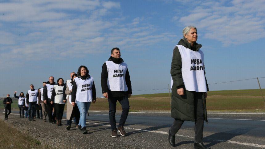 Ûysal, da zanîn ku baskên meşê dê di 13’ê sibatê de li Amedê bigihin hev û hemû gel vexwend meşê. Meşvan pişt re derbasî avahiya DEM Partiyê bûn.