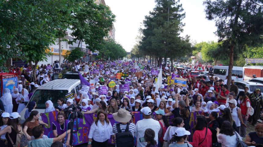 Li Amedê bi hezaran jin bi dirûşmeya “Jin ji bo aştiya civakî û çareseriya demokratîk dimeşin” meşiyan. Hevseroka Partiya Herêmên Demokratîk (DBP) Çîgdem Kiliçgun Uçar û Hevseroka Partiya Wekhevî û Demokrasiyê ya Gelan (DEM Partî) Tulay Hatîmogûllari jî beşdarî meşa ku di bin pêşengiya Tevgera Jinên Azad (TJA) de hat lidarxistin bûn.