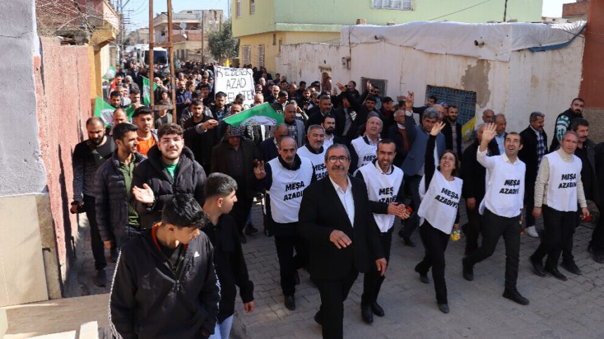 Di meşa ku piştî pêşwazîkirinê pêk hat de gelek caran dirûşmeyên “Bijî Berxwedana Zindanan”, “Bijî berxwedana Îmraliyê”, “Silav, silav ji Îmraliyê re hezar silav” û “Bijî Serok Apo” hatin berzkirin. Di meşê de pankarta bi nivîsa “Rêberek azad welatek azad” hat vekirin. Di meşa ku ji 7 salî heta 70’ê salî gelek kes beşdar bûn de dîmenên rengîn derketin holê. Welatiyên derdor jî eleqeyek mezin nîşanî meşvanan dan. Meş heta avahiya DEM Partiyê dom kir.