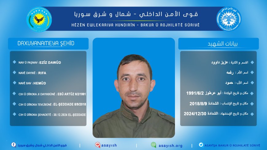 Fermandariya Giştî ya Hêzên Ewlekariya Hundirîn da zanîn ku 2 endamên wan şehîd bûne. Fermandariyê diyar kir ku endamên wan Ezîz Dawûd û Şeyhan Hedlan di 31’ê Kanûna 2024’an de di êrişên şaneyên DAIŞ’ê de şehîd bûne.