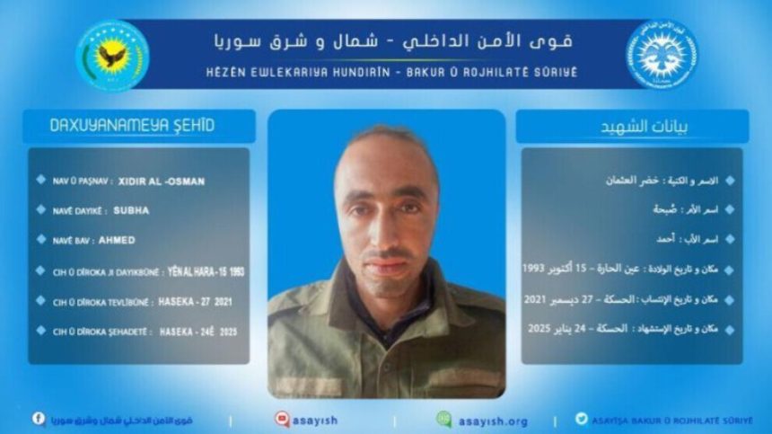 Fermandariya Giştî ya Hêzên Ewlekariya Hundirîn – Herêma Bakur û Rojhilatê Sûriy bi daxuyaniyekê nasnameya endamekî xwe ku di êrişeke şaneyên veşartî de li Hesekê şehîd bû eşkere kir.