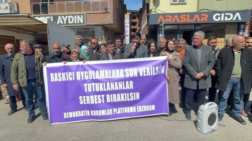 Pltaforma Saziyên Demokratîk a Erziromê, li pêşiya avahiya DEM Partiyê ya Erziromê daxuyanî da. Di daxuyaniyê de pankarta “Sepanên zextker bi dawî bikin, girtiyan berdin” hate hilgirtin. Daxuyanî, ji hêla Hevserokê DBP’a Erziromê Ramazan Karakaş ve hate xwendin.