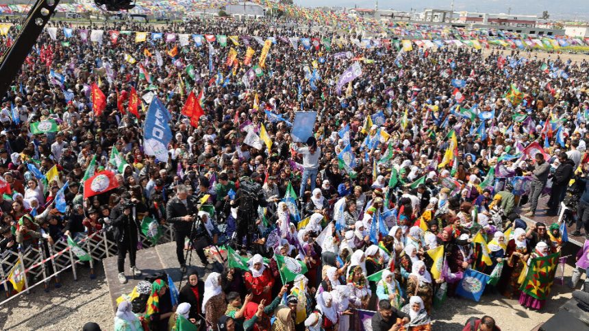 Bi dirûşma “Bijî Serok Apo” girseya gel derbasî nava qada pîrozbahiyê. Dayikên Aştiyê û xizmên girtiyan Nobeda Edaletê derbasî qada Newrozê kirin. Bi dirûşman daxwaza azadiya fîzîkî ya Abdullah Ocalan hate kirin.