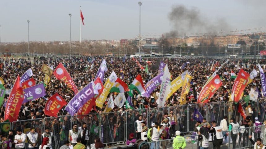 Li qadê dirûşmên “Bijî Serok Apo”, “Bê Serok jiyan nab e”, “Jin, jiyan, azadî” û “Bijî Newroz” olan didin.