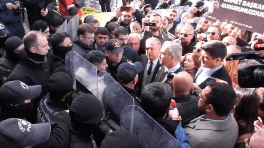 Şandeya CHP’ê ku Alîkara Serokê Giştî yê CHP’ê Aylîn Nazlikaya û Parlamenterê Stenbolê Sûat Ozçagdaş jî di nav de bû, li ber avahiya şaredariyê kom bû û xwest bikeve hundirê avahiyê, lê belê polîsên ku bend danîn pêşiya şaredariyê nehiştin CHP’yî derbasî avahiya şaredariyê bibin.