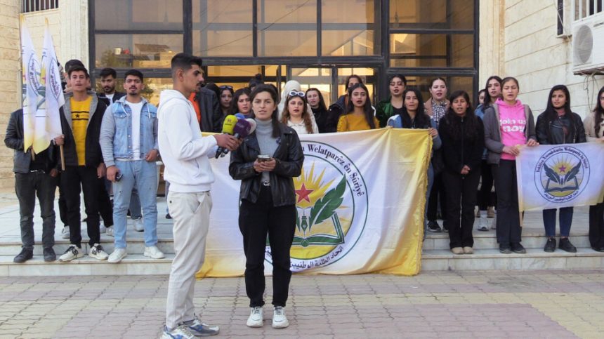 Yekîtiya Xwendekarên Welatparêz ên Sûriyeyê ji bo piştgirtiya gelê Efrînê û şermezarkirina van êrîşan, li pêşiya avahiya Zanîngeha Rojava ya li taxa Hilêliyê ya bajarê Qamişlo daxuyaniyek da. Daxuyanî bi zimanê Kurdî hat xwendin.