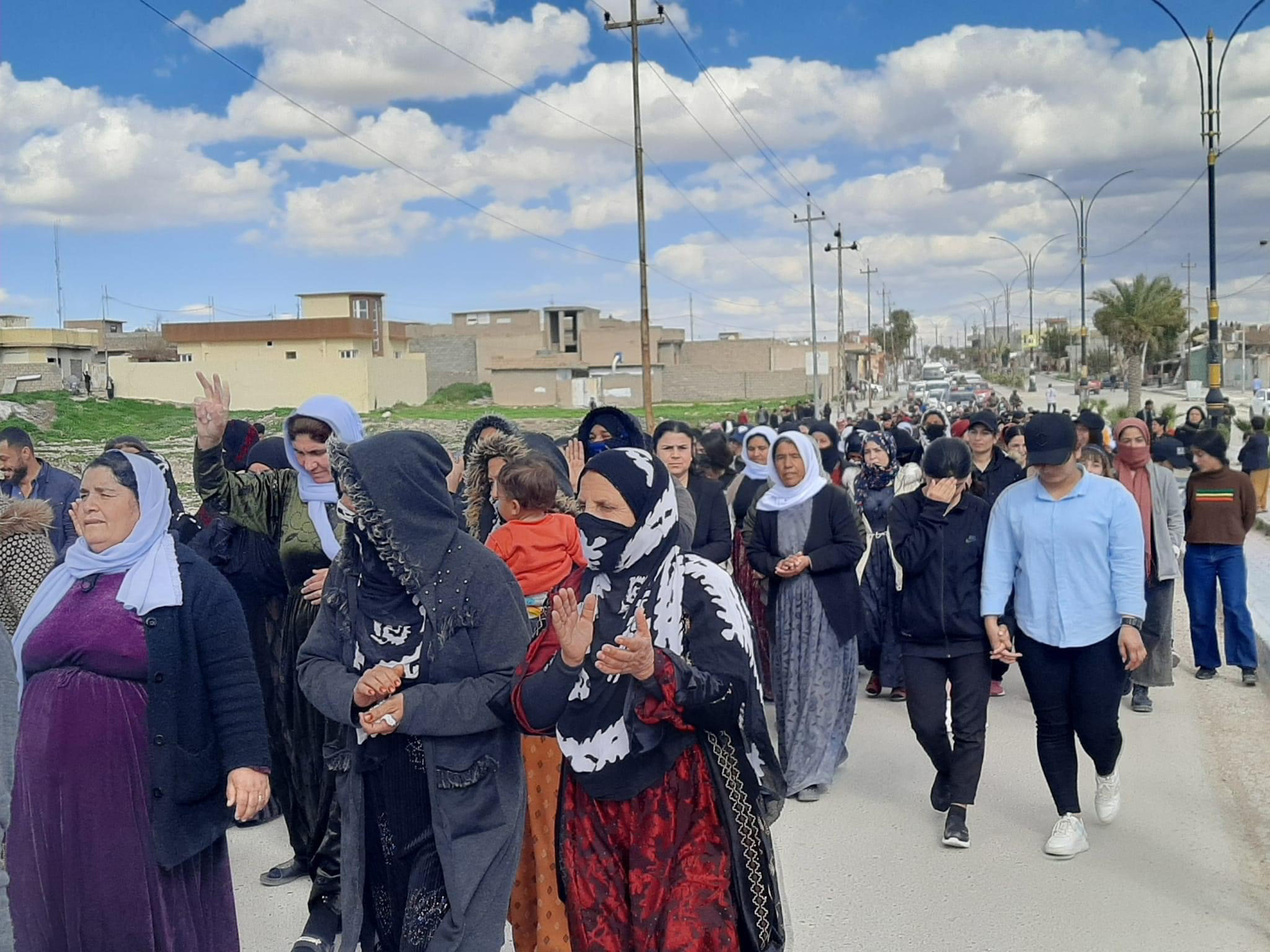 Hemû sazî û rêxistinên Şengalê û pêkhateyên Êzidî û Ereb li ber Mekteba Sor kom bûn û berzkirina dirûşmên ‘Ji dagirkeriya Tirk re na’, ‘Bijî berxwedana Şengalê’ û ‘Bimre xiyanet’ heta ber avahiya Navenda Ewlekariya Nîştîmanî ya Iraqê meşiyan.