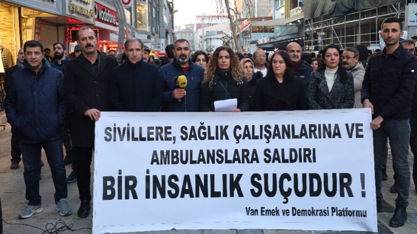 Platforma Ked û Demokrasiyê ya Wanê, li dijî êrîşên li ser sivîl û xebatkarên tenduristiyê ya Bakur û Rojhilatê Sûriyeyê li Kolana Hunerê daxuyaniyek da. Gelek pêkhateyên platformê tevlî daxuyaniyê bûn û pankarta “Êrîşên li ser sivîl, xebatkarên tenduristiyê û ambulansan sûcê mirovahiyê ye” vekirin û dirûşmeyên “Şer rawestînin, sivîlan biparêzin” hatin berzkirin.
