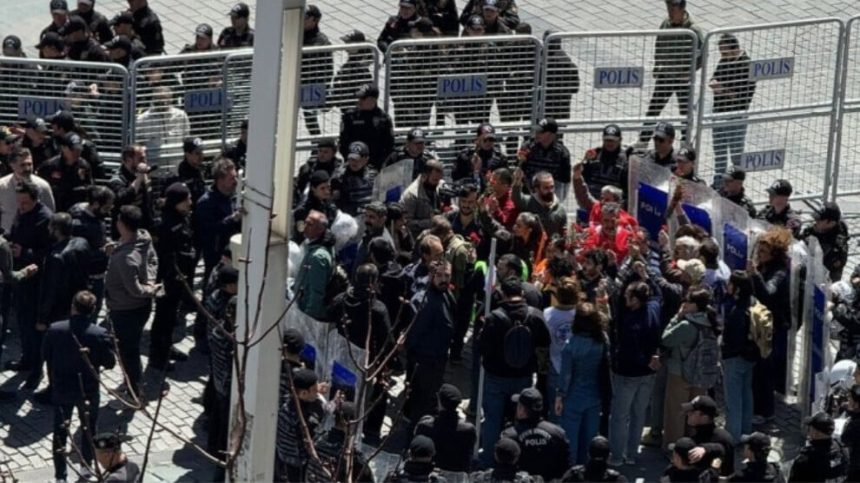 Înîsiyatîfa Taksîmê ya 1’ê Gulanê ji bo bîranîna 34 kesên ku 1’ê Gulana 1977’an li Taksîmê hatin qetilkirin xwest daxuyaniyekê bide çapemeniyê. Lê belê polîsan bi mertalan pêşî li komê girtin ku qurnefîl di destê beşdaran de bû.