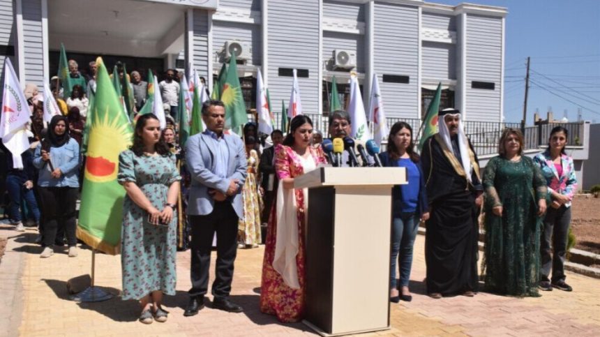 Hevserokê PYD`ê Salih Muslim û berdevka Kongra Star Rîhan Loqo daxuyanî li avahiya PYD`yê ya li taxa Kebabe ya Hesekê xwend. Endamên partiyê û Kongra Star tev li xwendina daxuyaniyê bûn.