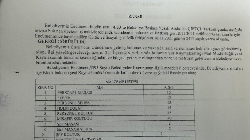 Hat diyarkirin ku Abdullah Çîftçî ku di sala 2021’an de hem Qeymeqamê Sûrê bû hem jî qeyûm bû, bi hinceta ku bûdçeya qeymeqamtiyê têr nake, ji bo Midûriyeta Darayî ya Qeymeqamtiya Sûrê bi awayekî nivîskî ji Şaredariya Sûrê ku qeyûmê wê bû daxwaz kir ku malzemeyên ofîsê bên kirîn. Heman kes îcar li kursiya şaredariyê rûnişt û ji bo pêşwazîkirina vê daxwazê, di sala 2021’ê de bi biryara encumenan bi bihayê 470 hezar TL’an malzemeyên ofîsê ji bo qeymeqamtiya Sûrê da kirîn.