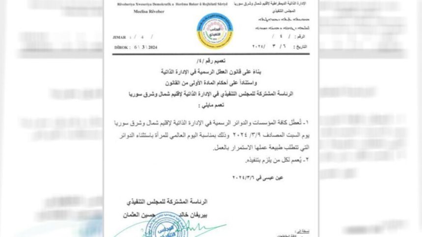“Bi boneya 8’ê Adarê Roja Jinên Kedkar ên Cîhanê tevahî sazî û daîreyên fermî yên Rêveberiya Xweseriya Demokratîk a Herêma Bakur û Rojhilatê Sûriyeyê roja şemiyê (9-3-2024) dike betlaneya fermî, lê tenê daîreyên karên wan berdewamê dixwazin nakin betlane. Ev giştîname dikeve pratîkê.”