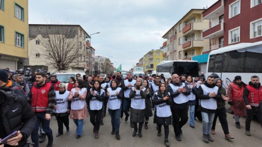 Polîsan hewl dan ku bi hinceta “Biryara qedexeyê heye” di têketina Licê de meşê asteng bike, gel astengiya polîsan nas nekirin, bi biryardarî û berzkirina dirûşman ber bi avahiya DEM Partiyê ve meşiyan.