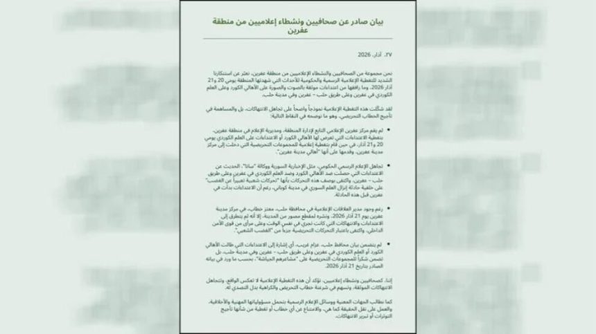 Rojnamevan û çalakvanên medyayê yên ji Efrînê îro daxuyaniyek der barê binpêkirinên ku qewimîne de parve kir û dezgehên medyayê yên hikûmeta demkî û berpirsên hikûmetê ji ber berovajîkirina rastiyan, paşguhkirina binpêkirinên belgekirî û tehrîkkirina li dijî Kurdan berpirsiyar dîtin.